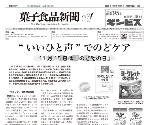 主な記事… ▪️“いいひと声”でのどケア 11月15日は「のど飴の日」 ▪️「のどケア」などの機能性が選ぶ決め手 ▪️明治 チョコレートを“飲む”イベント開催 ▪️じゃがいもでんぷんを“代替のり”に カルビーがアップサイクル商品 ▪️糖質を抑えながら、さらに美味しく モンテール 『スイータス』にリニューアル...