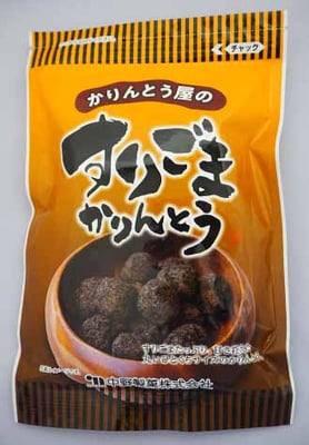 写真右から、香り豊かなすりごまかりんとう、こだわりの味の黒かりんとう、モンゴル塩を使った塩 かりんとう