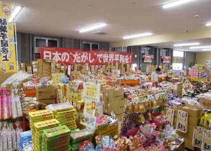 ◀︎「日本の“だがし”で世界平和を!」の横断幕が目を引くメイン売り場