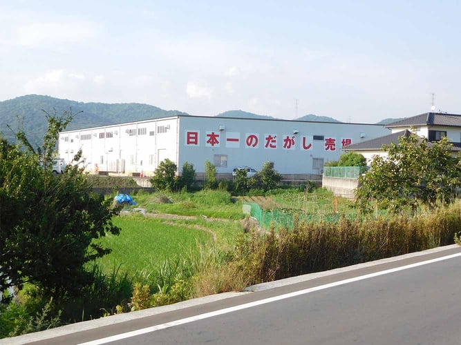 ▲田園地帯に現れる巨大看板「日本一のだがし売場」が印象的