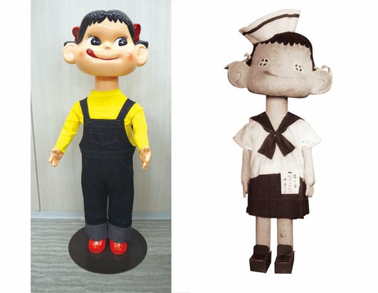 写真右・最初のペコちゃん人形は紙の張り子だった