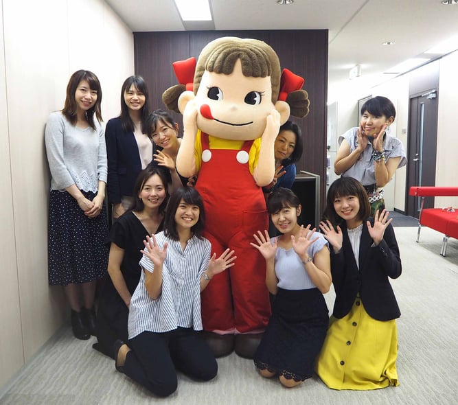 写真・ペコちゃんを囲む女性社員(本社にて)