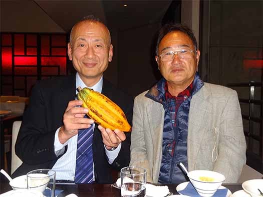 2013年11月、平塚社長(左)と、小笠原から初収穫の実を持参した折田農園経営者の折田一夫氏(右)