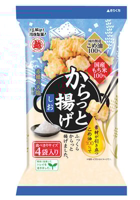 やさしい甘味が感じられる国産もち米を100%使用し、お米の風味を損なわないこめ油100%でからっと軽い歯ざわりに仕上げた揚げ餅。パッケージは、プラスチックごみ削減への取り組みとしてトレイを使用せず、かつ外装包装をスリム化している。