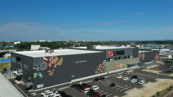 愛らしい『ぱりんこ』の公式キャラクター『ぱるん』『りるん』をはじめ、三幸製菓を代表するおせんべい各種のイラストをあしらった外観は、まるでアミューズメント施設のような親しみやすさを感じさせる。三幸製菓が2021年10月に新設した新発田第5工場(新潟県新発田市、以下第5工場)は、見た目も中身も、同社のこれまでの生産工場とは一線を画す。IoTの導入や省人化など、効率を重視する路線をさらに推し進めながらも、地域にも従業員にも配慮した設計になっている。