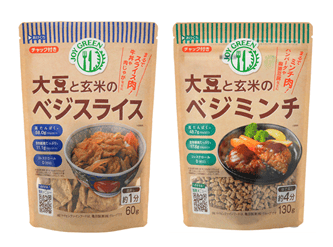 『大豆と玄米のベジミンチ』は、大豆独特の香りを抑えて食べやすくリニューアル。130g/1㎏・税抜320円/―、賞味期間2年。新商品の『大豆と玄米のベジスライス』は、湯戻し1分の利便性の高さが特徴。60g/1㎏・税抜320円/―、賞味期間1年