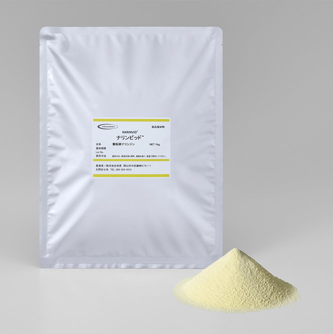 その一つが今年5月に販売を開始した『ナリンビッド』(写真)だ。独自の酵素技術で柑橘由来のナリンジンに、澱粉由来のグルコースを結合させた高水溶性味質改善素材。微量でキレのよい苦味が付与できるほか、柑橘の果汁感向上や食品の味質調整剤としても活用できる。