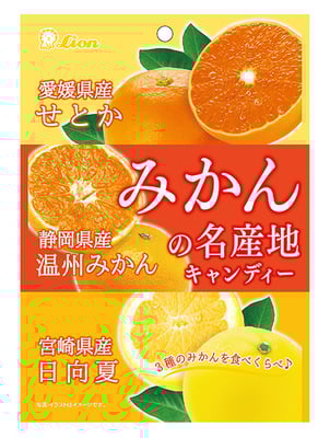 『名産地キャンディー』シリーズは、これまでに桃、ぶどう、苺を出しており、今回はその第4弾となる。甘味が強く、香りを立たせた「愛媛県産せとか」、酸味と甘味のバランスを良くした「静岡県産温州みかん」、グレープフルーツに近い味わいの「宮崎県産日向夏」の3種のみかんの味わいを食べ比べできる。ターゲットは10代から40代の女性。67g、OP。