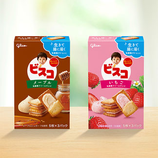 From the lactobacillus cream sandwich biscuit line "BISCO," Glico is releasing new flavors on August 8th: "Maple" (left in the photo) and a significantly revamped "Strawberry" (right in the photo). For the cream filling of the "Maple" flavor, they use maple sugar made by simmering maple syrup solely from Quebec, Canada. To enhance the maple flavor, a hint of caramel powder is included in the cream. The strawberries used in the "Strawberry" flavor are meticulously selected for their variety, using only fully ripe, deep red strawberries. These are harvested, frozen while fresh, and then freeze-dried into a powder. This process retains the authentic sweet-tart flavor of strawberries, which complements the biscuit. Both flavors use whole grain milk biscuits with a gentle taste. Sold in packs of 5 pieces, 3 packs per box.